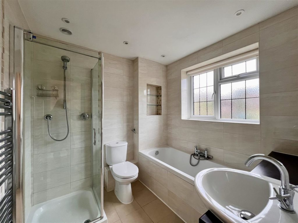 Fully tiled family bathroom. Suite comprises of a bath, stand alone shower, wc and wash hand basin. Obscure glazed window.