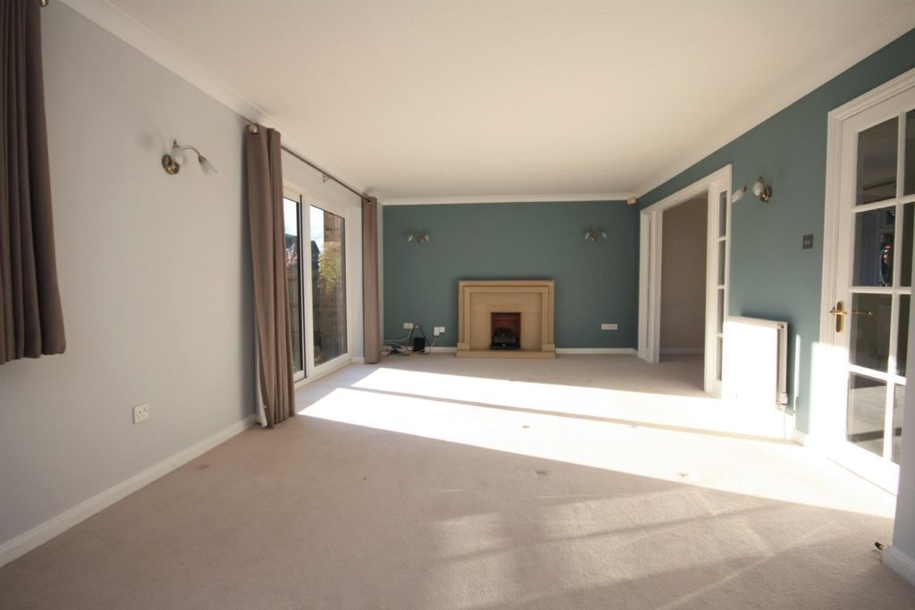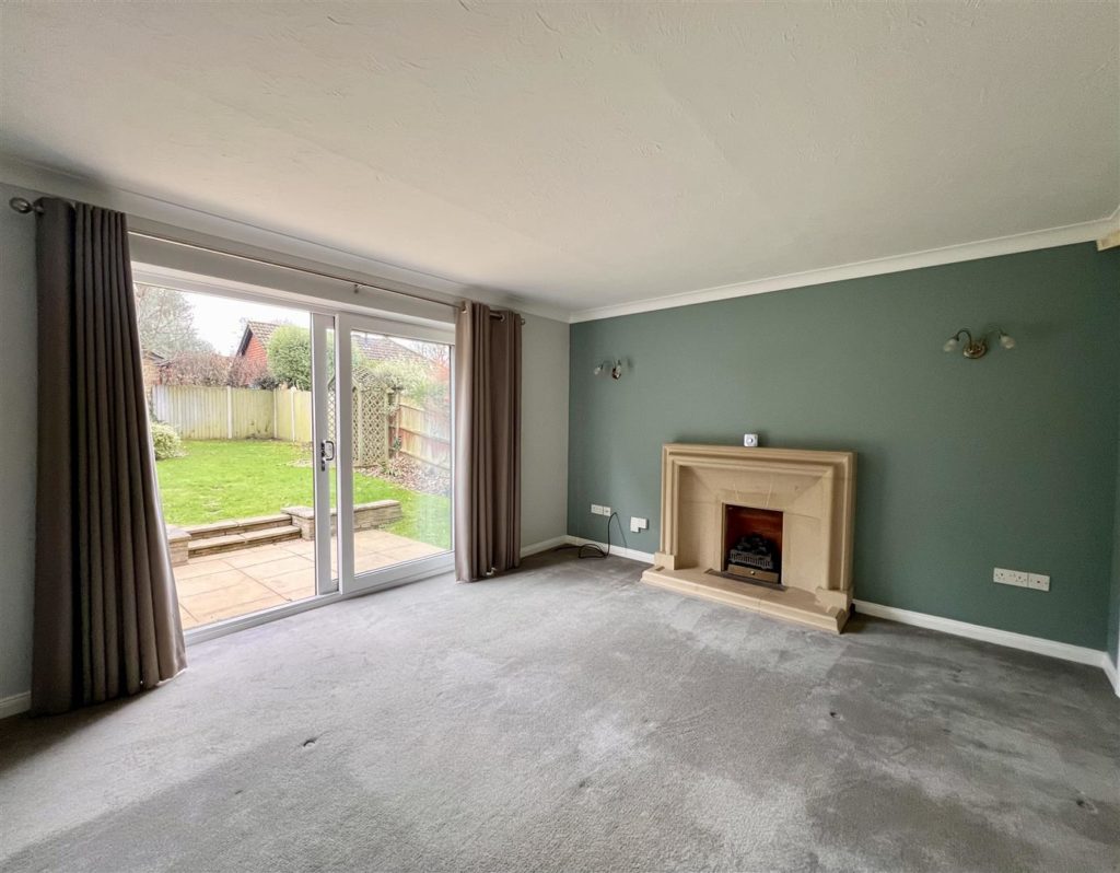 Spacious room with neutral décor and carpet. Feature fireplace and sliding doors that lead to the pretty rear garden.