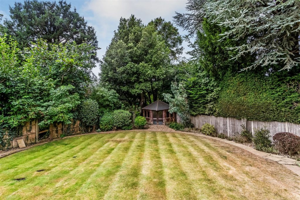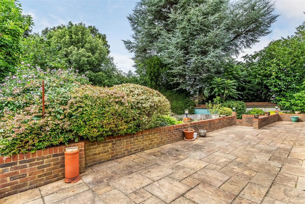 Wrap around patio with a landscaped rear garden. Mostly laid to lawn with flower beds