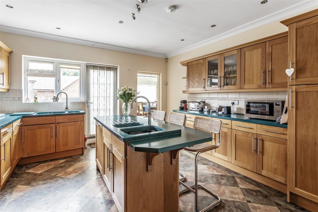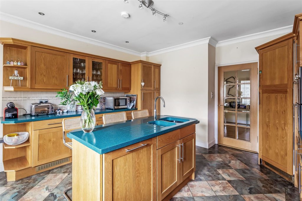 Fully fitted kitchen with a range of wall and base units. Fitted appliances include built in cooker, dishwasher, larder fridge, under counter freezer and pull out pantry. Breakfast bar with seating for 3 people.