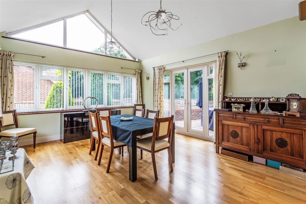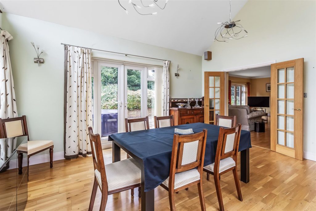 Door leading from kitchen to a triple aspect dining room with vaulted ceiling. Double doors leading to the garden.