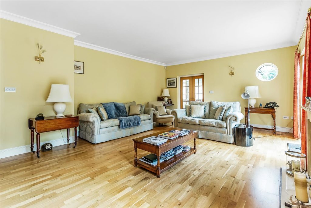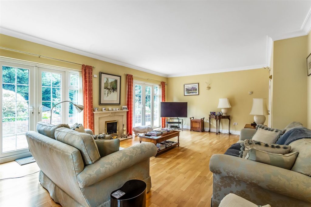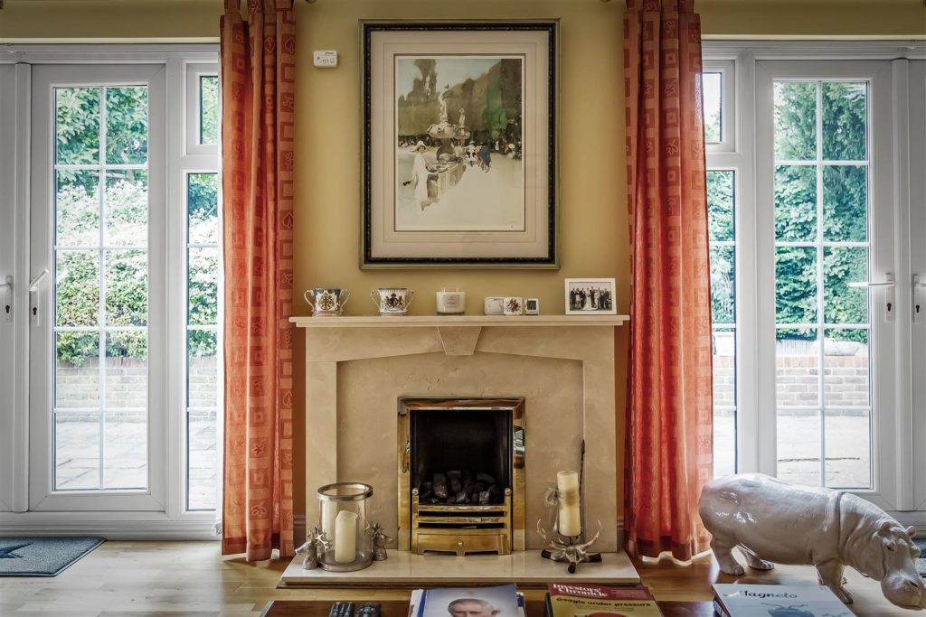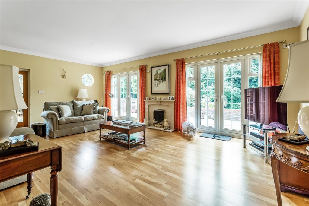 Light and bright living space with twin patio doors providing views of the garden. Central fireplace and hardwood flooring.