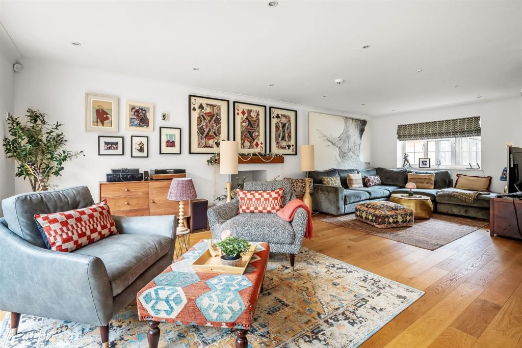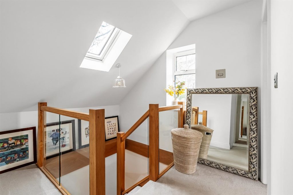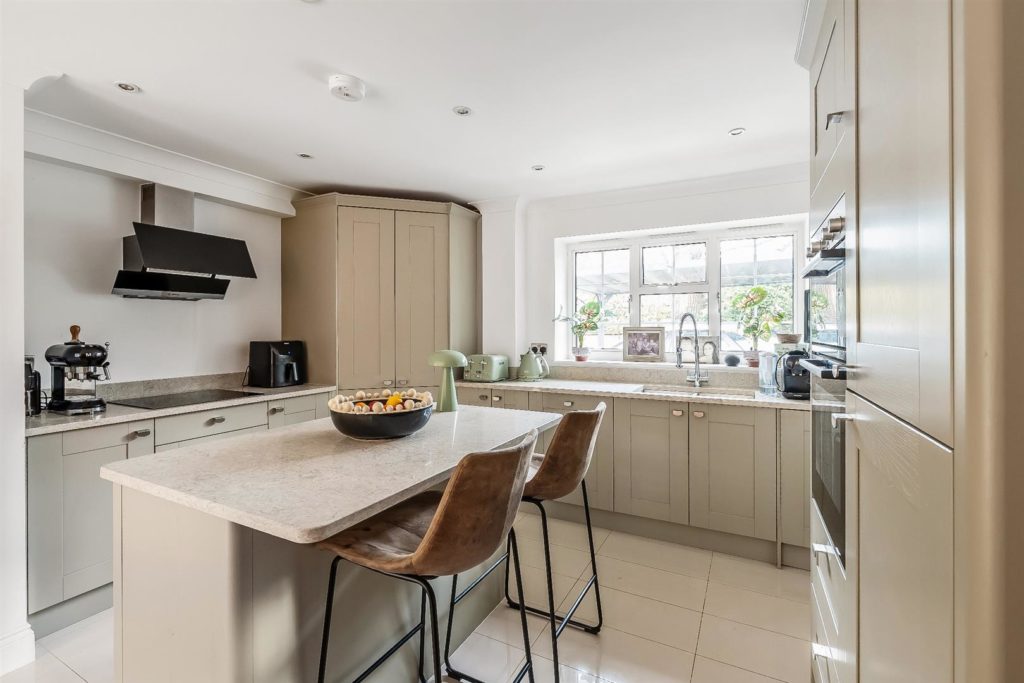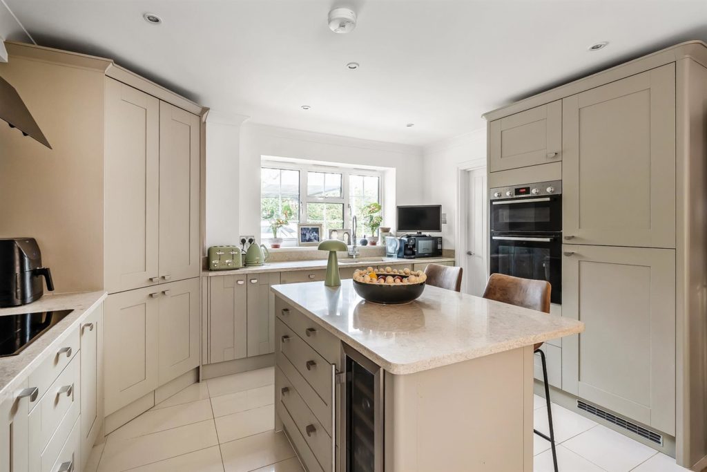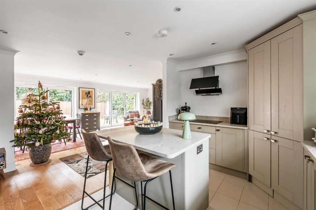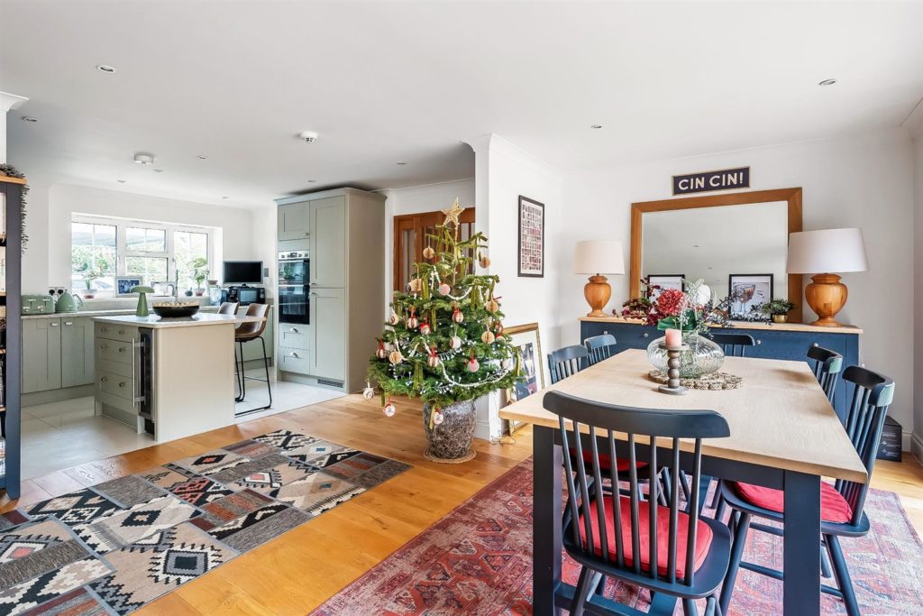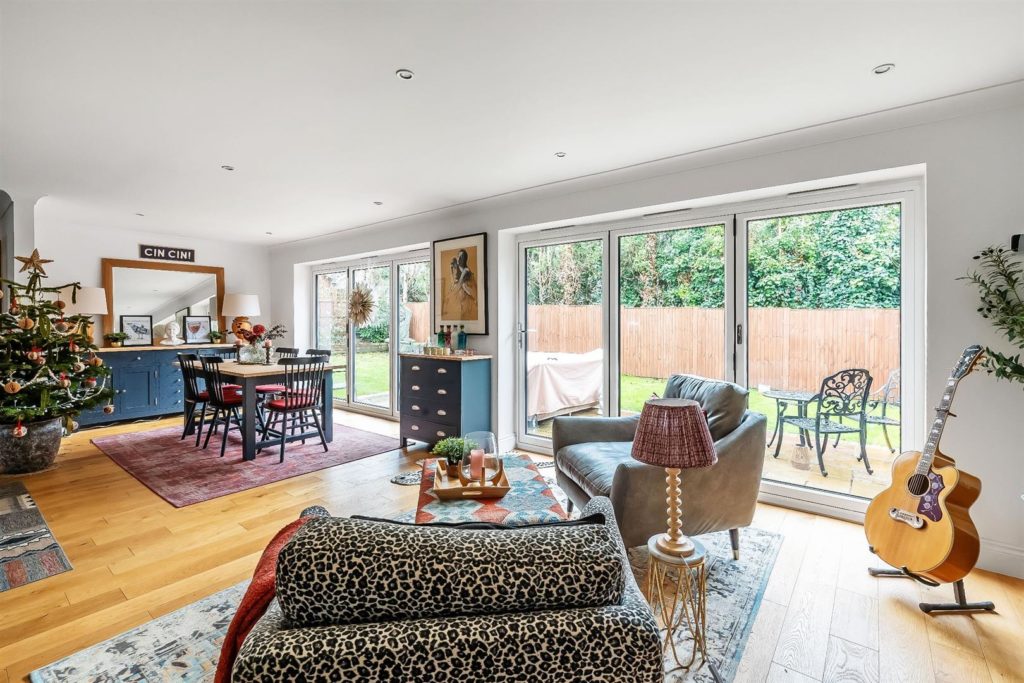The front door opens onto an impressive entrance hall with a cloakroom and useful under stairs storage. A double aspect study/office sits to the front. Stylish oak double doors lead through to a stunning open plan kitchen/dining/family room, featuring two large tri-fold doors that open onto a westerly patio and garden. The contemporary kitchen includes Bosch integrated appliances, a wine cooler, a central island, quartz worktops, generous space for dining, relaxing and entertaining.