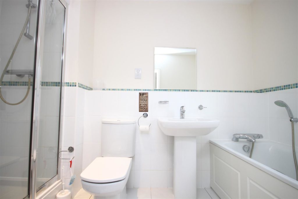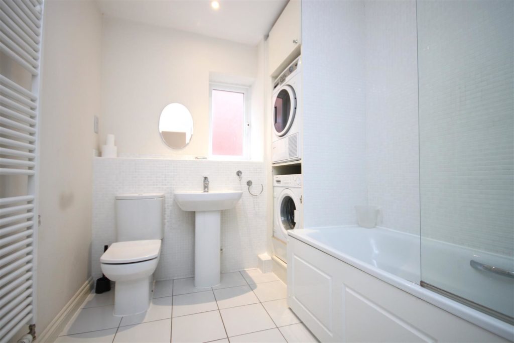 With bath tub and overhead shower, hand basin, w.c., washing machine and tumble dryer.