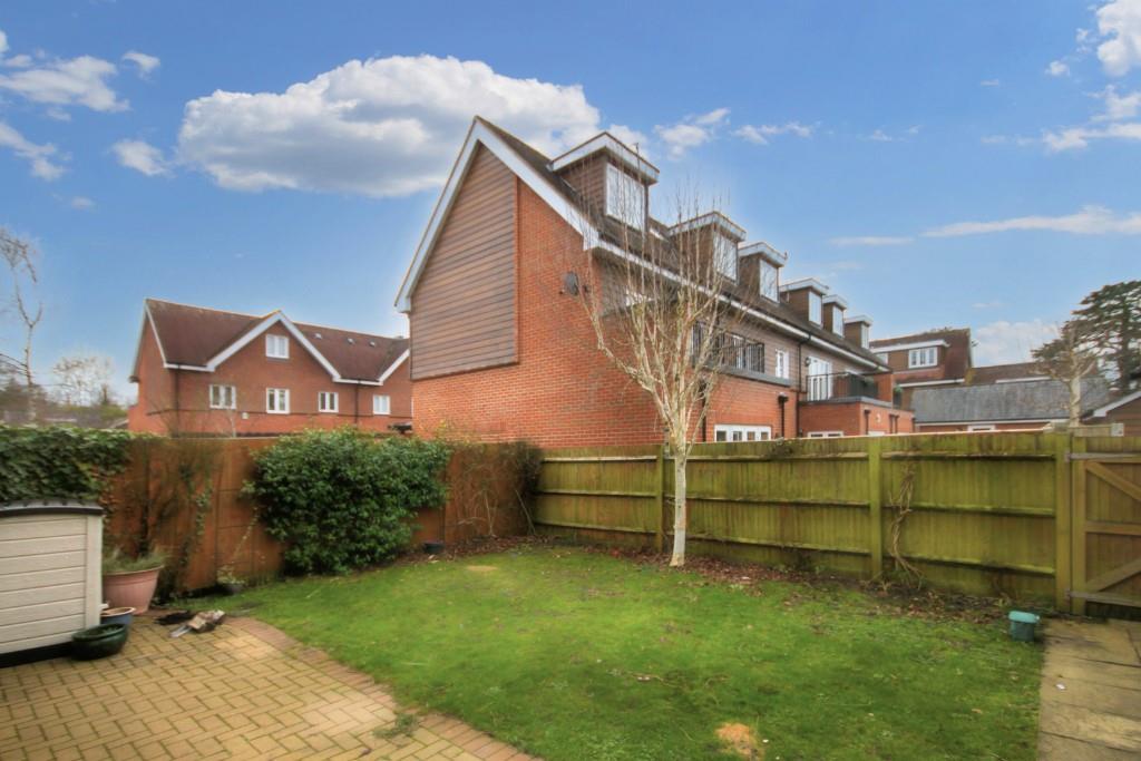 Rear garden with two side access gates and a rear gate leading to the allocated parking space in front of the garage. The garden is fence enclosed and private, with a wide patio, small area of lawn and planted
