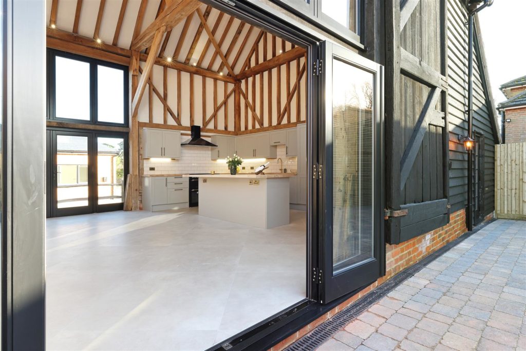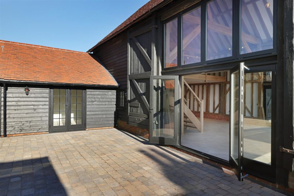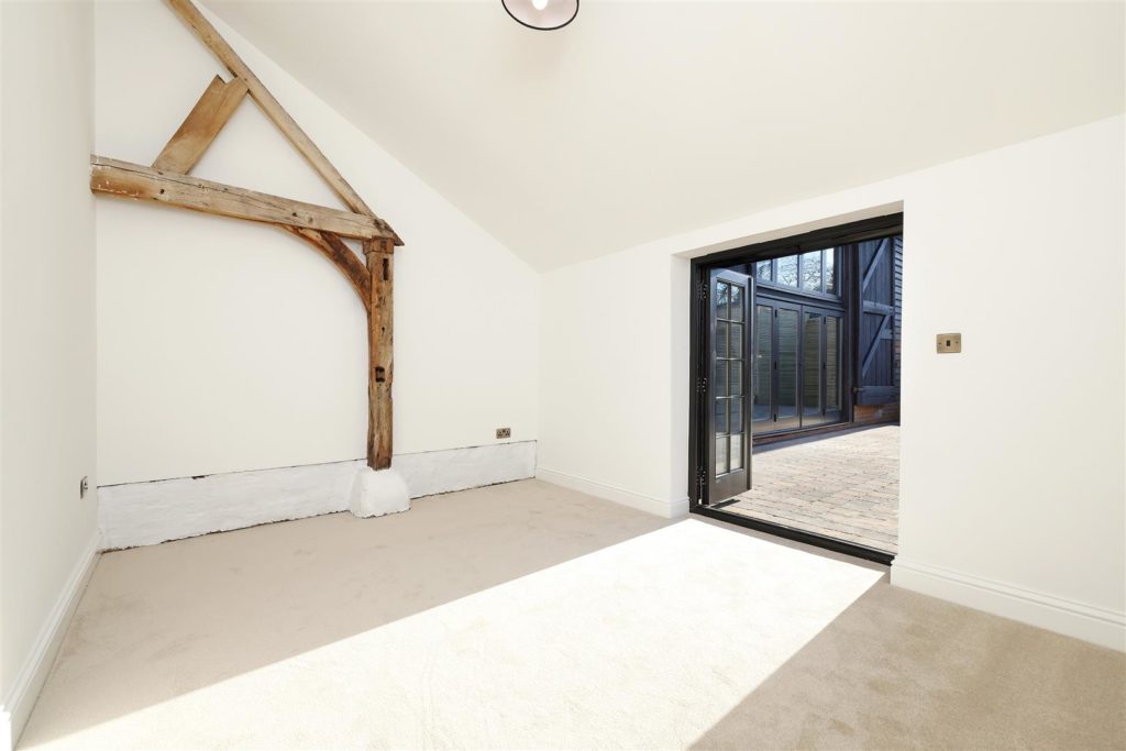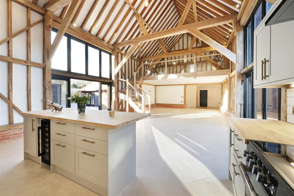 The open-plan kitchen/dining and living area is designed with family living in mind. The space has a fantastic quality of natural light, care of large picture windows and glazed doors on both sides that fill the opening of the original double height barn doors. Glazed doors open onto both the courtyard and a small garden creating a seamless connection between indoor and outdoor spaces. The kitchen features a central island and sleek Shaker-style cabinetry running along the walls, housing high-end appliances, with a separate utility room and boot room.