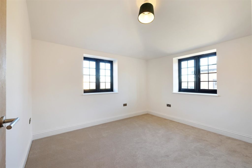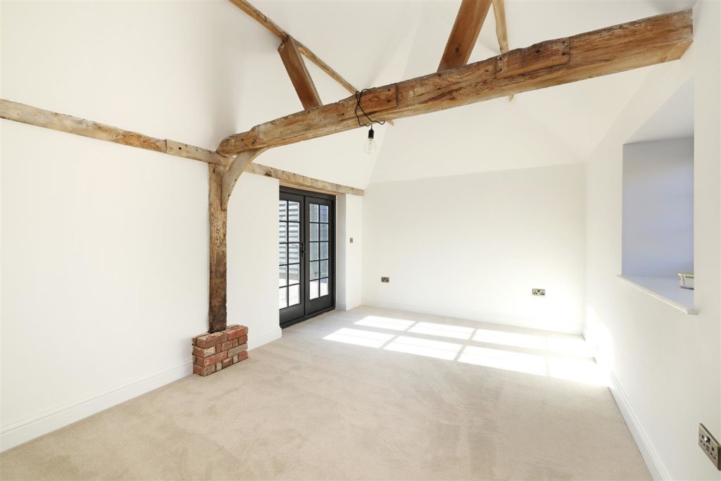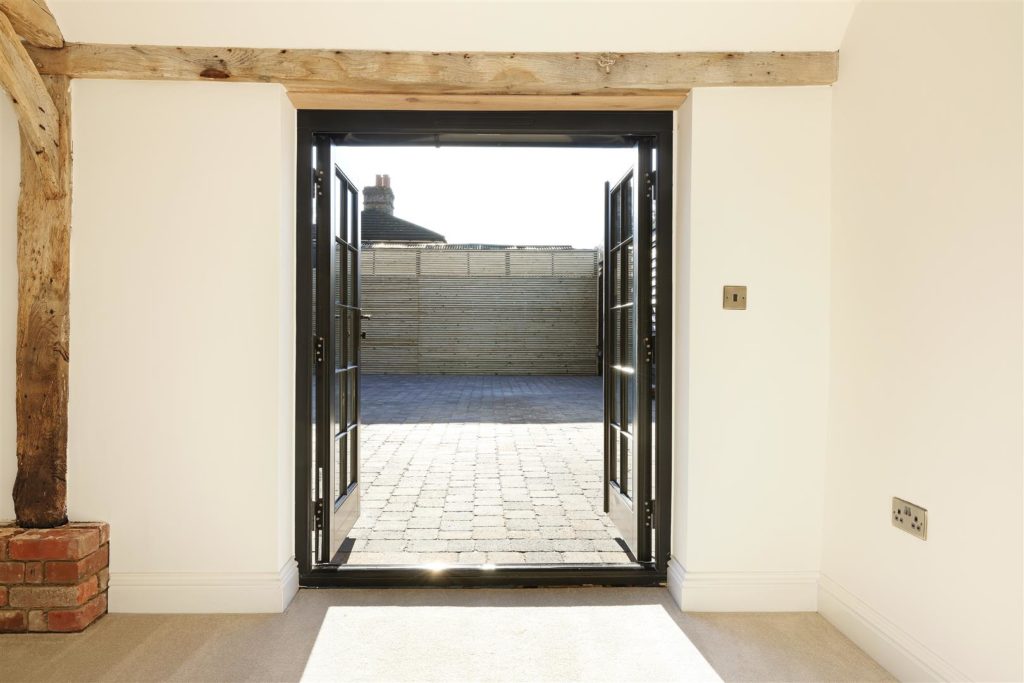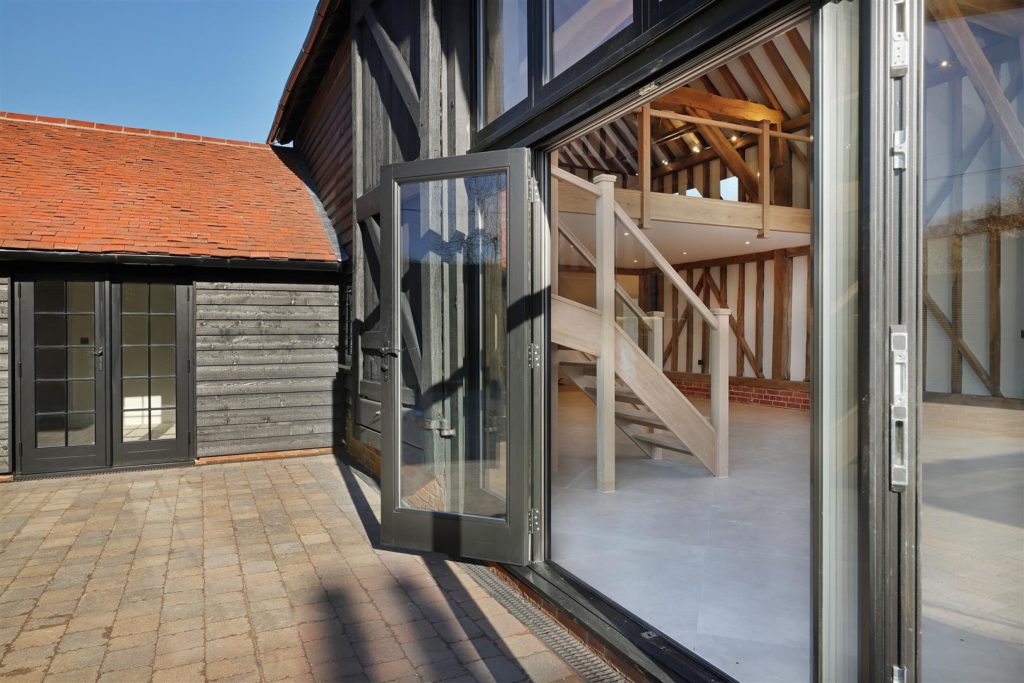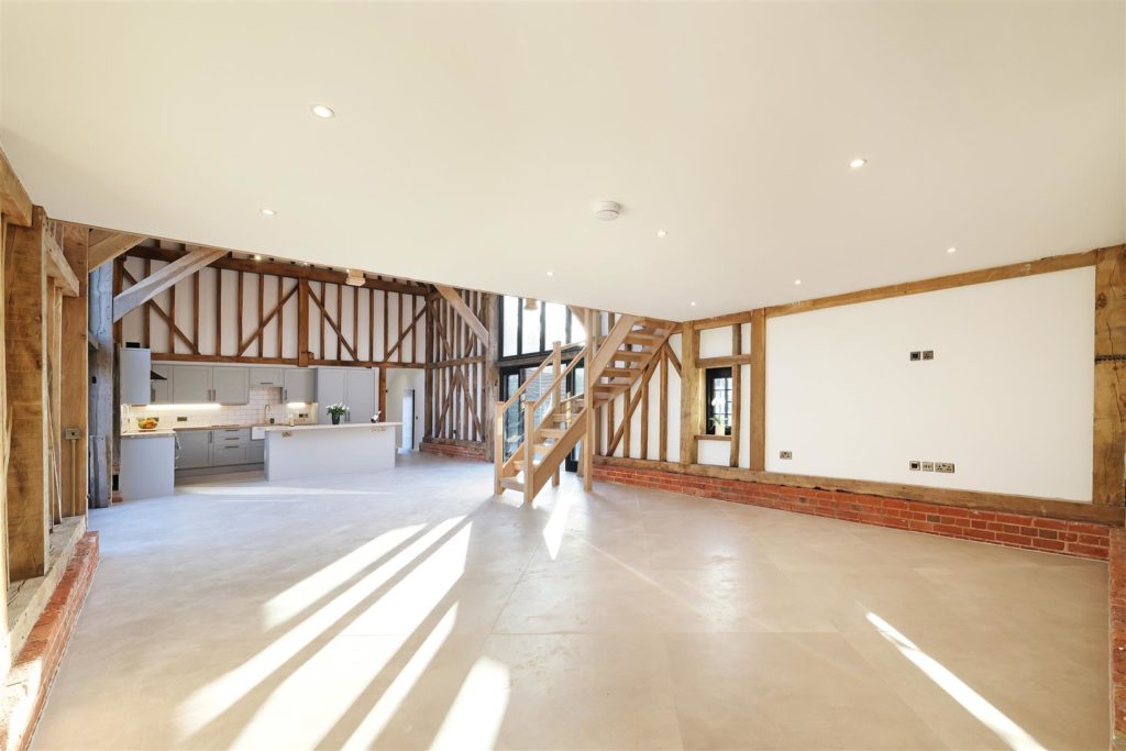The open-plan kitchen/dining and living area is designed with family living in mind. The space has a fantastic quality of natural light, care of large picture windows and glazed doors on both sides that fill the opening of the original double height barn doors. Glazed doors open onto both the courtyard and a small garden creating a seamless connection between indoor and outdoor spaces. The kitchen features a central island and sleek Shaker-style cabinetry running along the walls, housing high-end appliances, with a separate utility room and boot room.