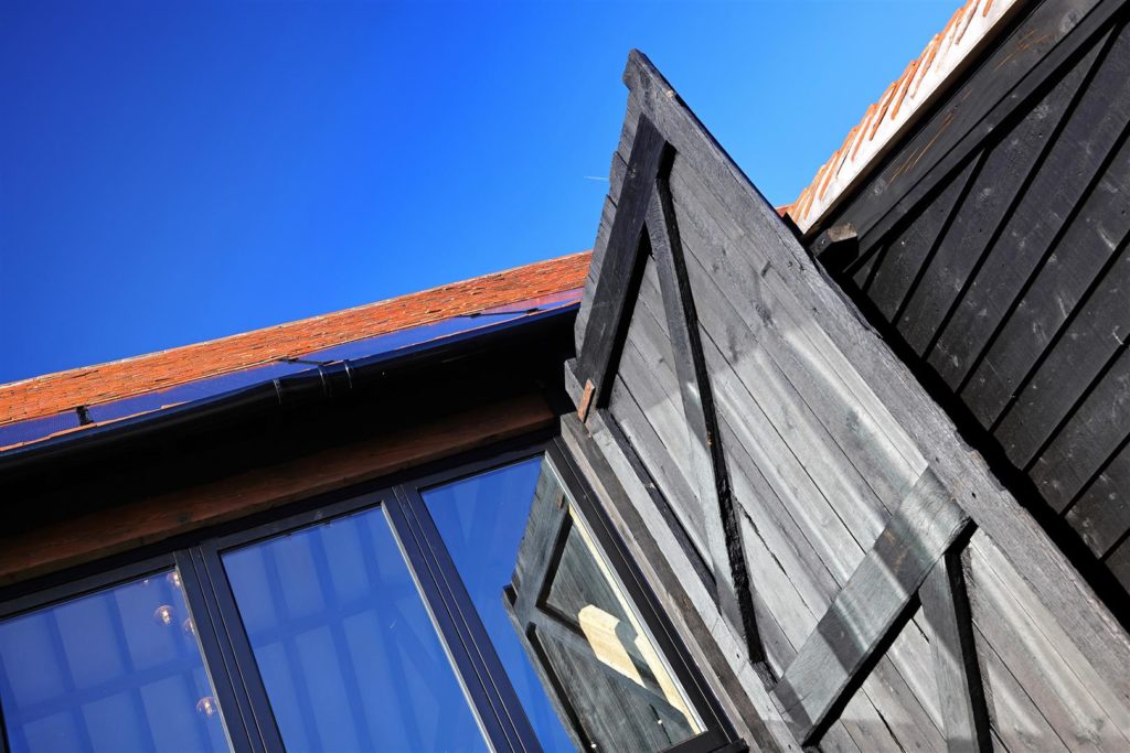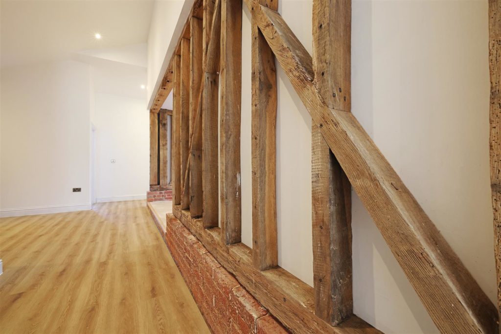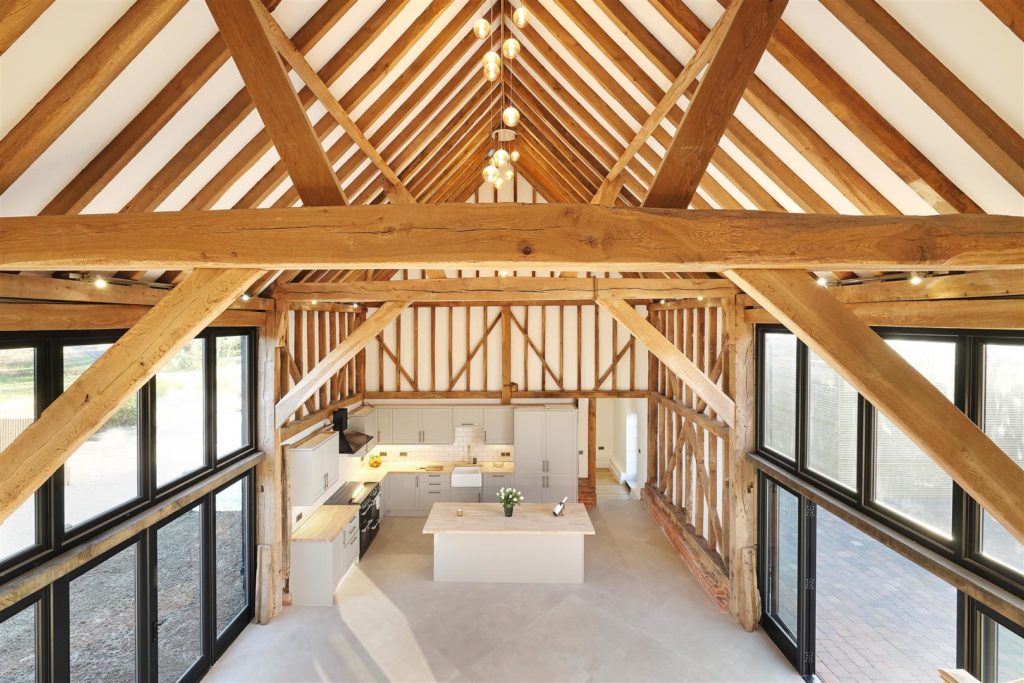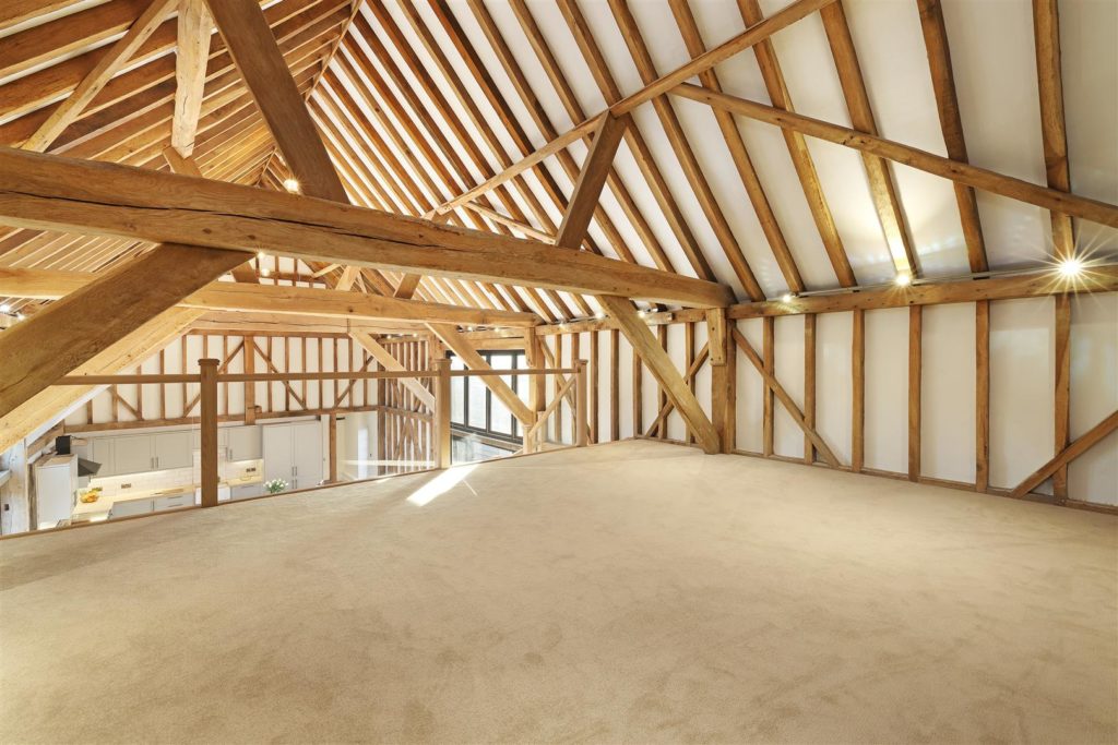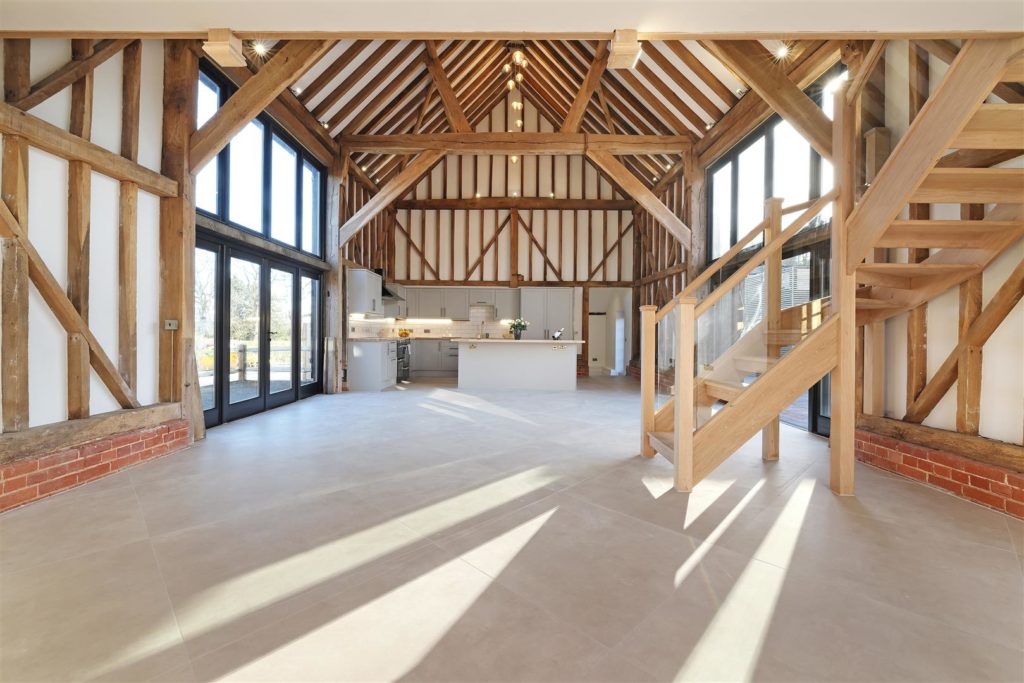 The entrance leads into a spacious reception hall and seamlessly connects to the heart of the home, an impressive double-height living/dining area, where the dramatic pitch of the ceiling is framed by stunning timber beams. Large windows flood the space with natural light, and the airy atmosphere is enhanced by a mezzanine level with a snug, accessed via an oak and glass staircase.