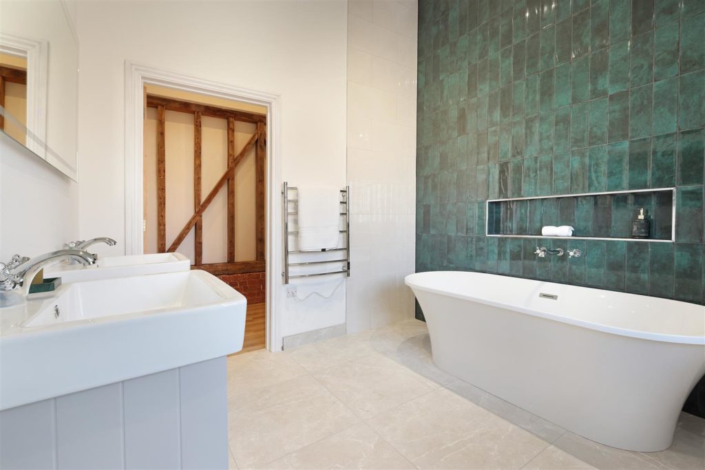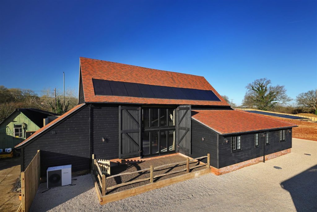 The main bedroom suite and the second bedroom include original features and glazed doors opening onto the private courtyard. Two additional en-suite bedrooms offer privacy and comfort, while a family bathroom with a freestanding bath and his-and-her sinks provides a luxurious space to unwind. The barn boasts excellent energy efficiency, high insulation, an air-source heat pump, and underfloor heating throughout. Outside, there is ample parking, an EV charger and a Buildzone 10 Year Build Warranty.